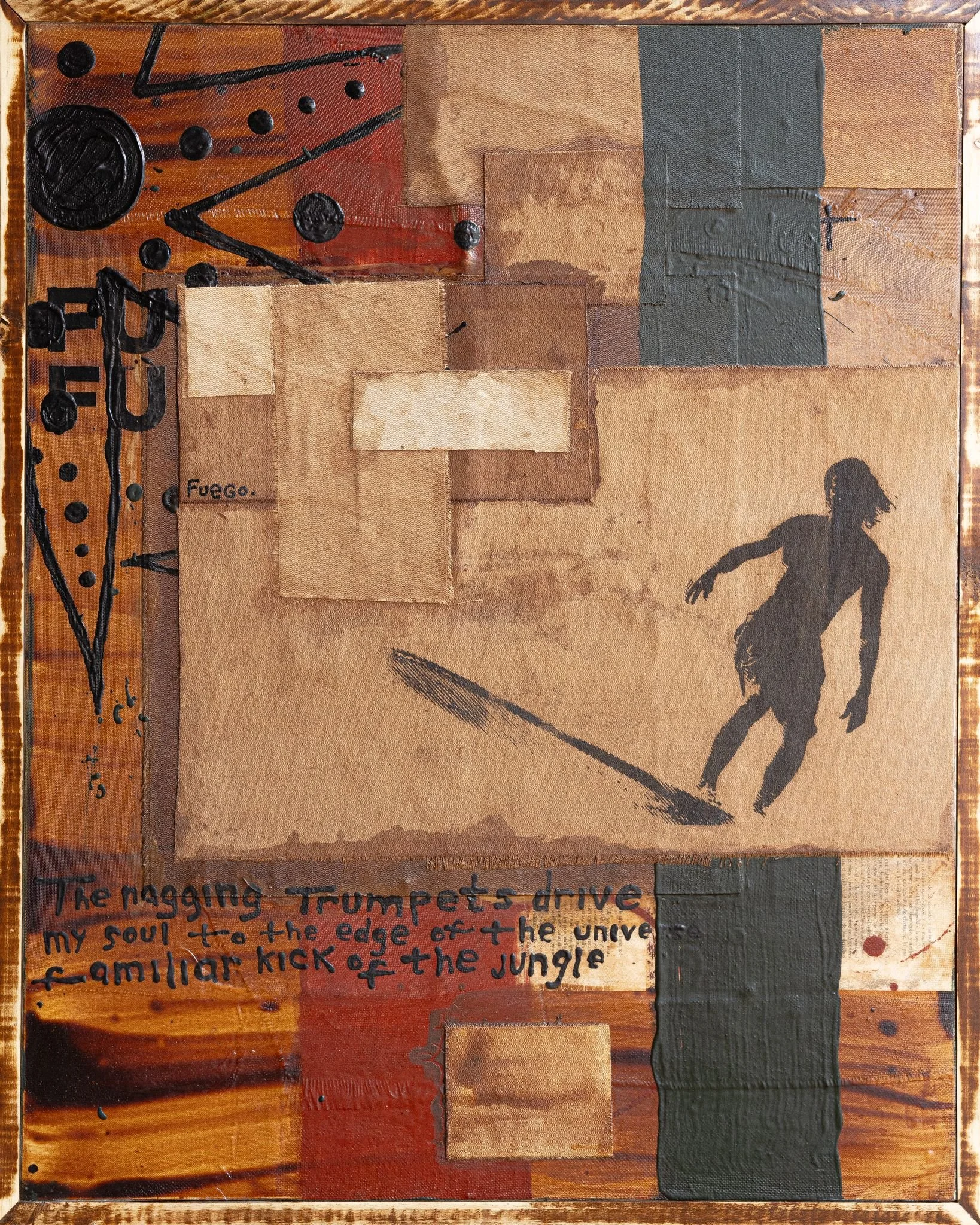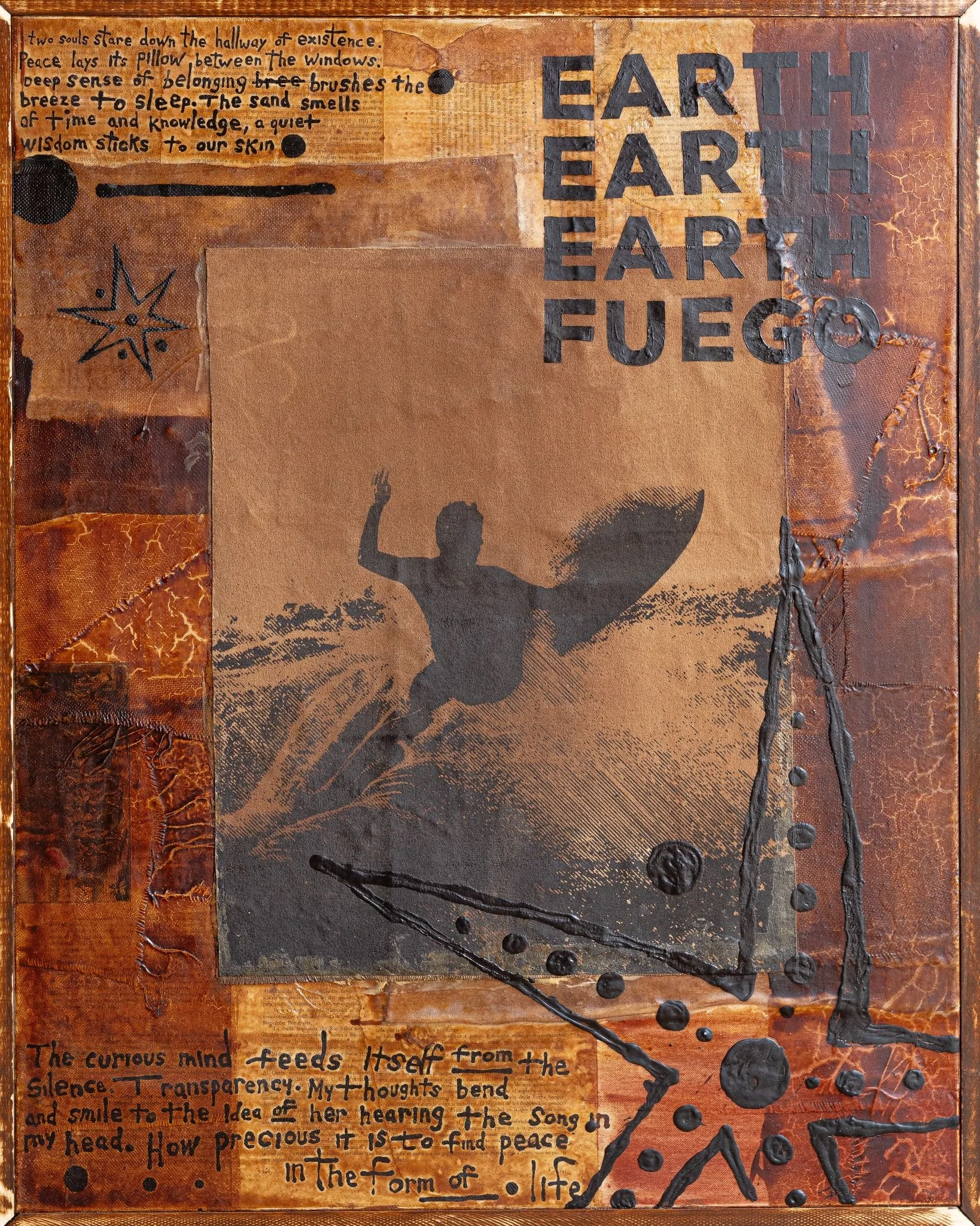 His process highlights a range of mix media techniques: Standing out in high contrast, the photographs Dorian took in Costa Rica, Peru, and the Canary Islands join the collage as screen prints on canvas. He achieved the dynamic texture of the works with fiberglass, resin, canvas cloth, and varnish. The main brown colour scheme comes from Dorian’s experimentation with coffee stains. The written texts dancing on his creations were gathered throughout his travels. In his writing, Dorian delves into spiritual topics, philosophical questions and an exploration of his lived experiences.
